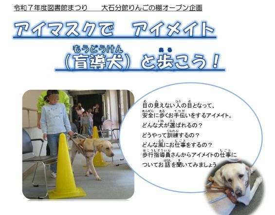 | 詳細内容 | 目の見えない人の目となって、安全に歩くお手伝いをするアイメイト。 どんな犬が選ばれるの? どうやって訓練するの? どんな風にお仕事をするの? 歩行指導員さんからアイメイトの仕事についてお話を聞いてみましょう。  |