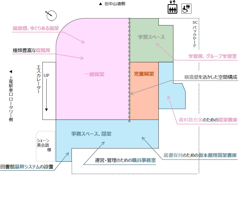 上尾市図書館では、老朽化の解消と利便性向上のため図書館本館(昭和56年開館 上尾市上町1-7-1)の改修工事を行う予定(令和8年度末頃から令和10年度末頃 休館予定)です。工事期間中も図書館サービスを継続して提供するため、JR上尾駅東口前に立地するまるひろ上尾SC内に新たに設置する図書館分館(通称:仮本館[以下「新・駅前分館」と表記します])を設置し、本館機能を一時移転します。新・駅前分館の整備構想(ゾーニング)等の検討状況をお知らせします。